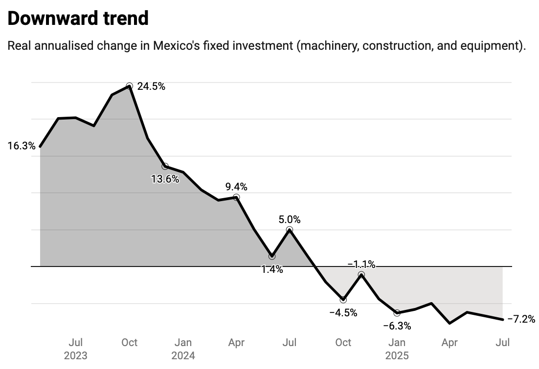 Meanwhile, the fall in investments around manufacturing and construction should ring alarm-bells, both in Mexico and the US—whose trade war with the world has only highlighted the latter’s dependence on its southern neighbour.