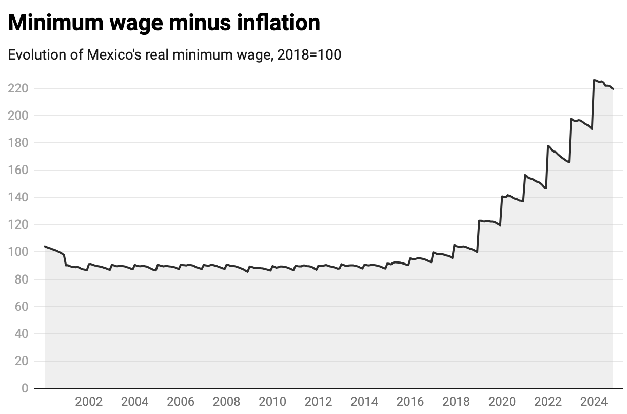 By 2018, the Mexican minimum wage had not grown in real terms since the turn of the century. Then, a left-wing government under the Morena party was elected. In consultation with the private sector, the minimum wage was more than doubled within four years. Suddenly getting a job that paid taxes and social security also meant getting a sizable wage increase, particularly between 2020 and 2024.