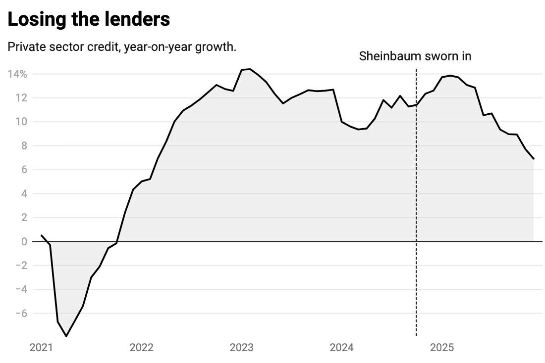 The government is taking these steps in the face of growing economic headwinds. Despite taking a more business friendly approach than her predecessor, during her watch Sheinbaum has seen year-on-year loan rates fall.