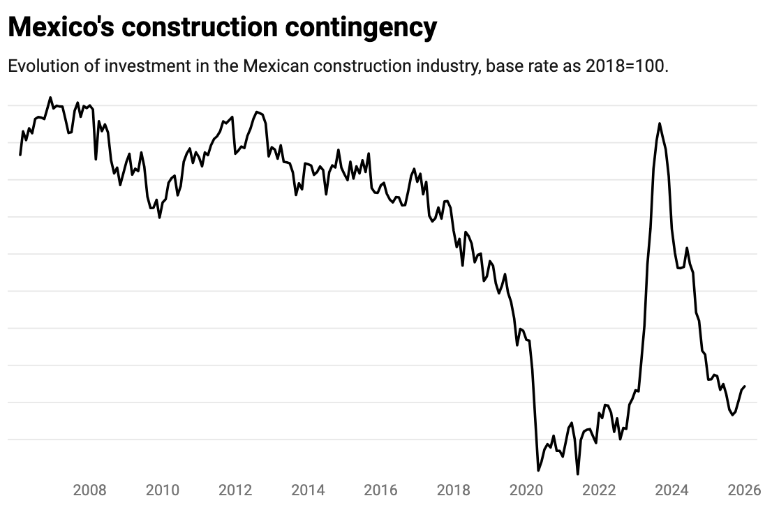 The big spike in the graph comes from substantial end of term investment by Andrés Manuel López Obrador in the lead up to the 2024 elections. Once public investment was gone, construction collapsed once again.