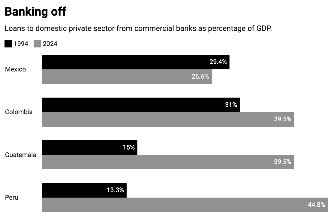 Mexicans famously can’t get any credit from the country’s financial institutions, but neither can companies. While the rest of Latin American banking has surged, loans from commercial banks to local businesses in Mexico have slumped.