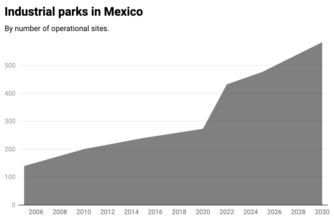 The government pledged 100 new industrial parks by the end of Sheinbaum’s term in 2030. Yet, because the government doesn’t have the money to carry out these investments, what this promise has amounted to is chiefly to facilitate the private sector to build.